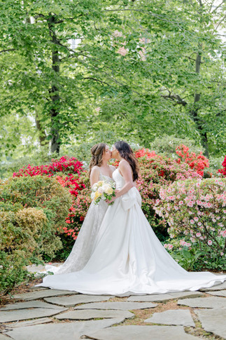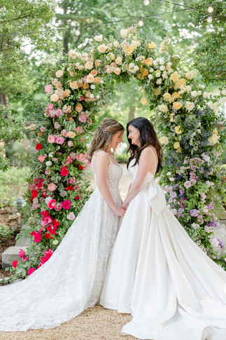 This wedding was one of our absolute favorites from spring. Let's start with the fact that both of the bride's chose to carry bouquets, so we got to make TWO bridal bouquets for this one! Then there was the arch. We knew the ceremony would take place in the Linden Grove at Meridian House in Washington DC and wanted to make a statement. They knew they wanted a subtle rainbow arch, but didn't want it to scream gay pride. But they are gay and proud and wanted to give a nod to their favorite gay symbol. We absolutely love the way it turned out, with the subtle color shift from red to peach to yellow to purple, with green throughout. The rest of the wedding used a lovely pastel palette of whites, soft pinks, and butter yellow. The colors looked lovely inside Meridian House and we loved absolutely everything about this wedding!