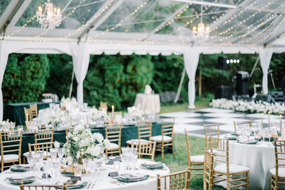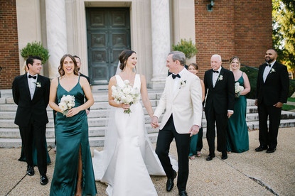 Jessica Ashley Events perfectly planned this gorgeous private estate wedding in Great Falls, Virginia. The couple wed at The Chapel of the Lady of Lourdes at Georgetown Prep, with the cocktail hour and reception at the groom's family home in Great Falls. The couple went with a classic palette of green, white, black, and gold. The linens were a lush, velvet emerald green and the white flowers were a perfect contrast. The taupe tones of the taper candles played off the earth tones in the white blooms. The reception took place under a clear top tent with the most fun dance floor. It was black and white checkered with a floral accent all along the back edge in front of the band. A definite favorite from the fall! Captured by Anna+Mateo. Enjoy!
